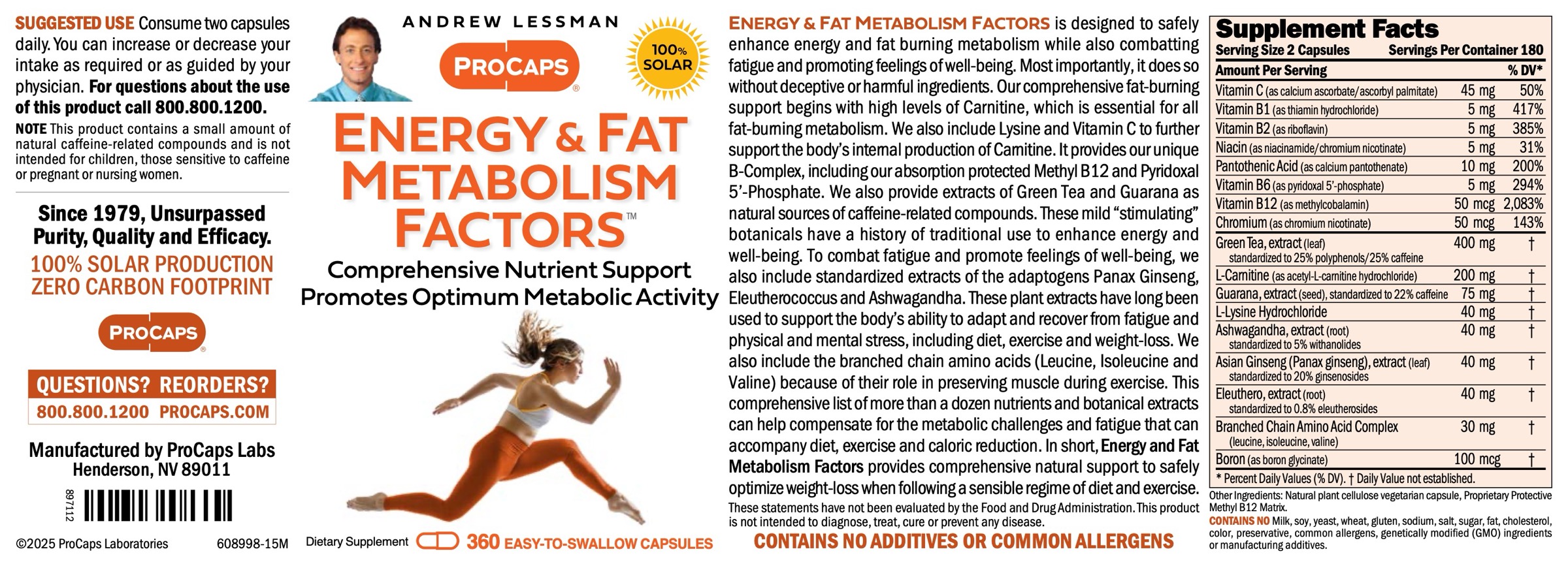 ENERGY & FAT METABOLISM FACTORS is designed to safely enhance energy and fat burning metabolism while also combatting fatigue and promoting feelings of well-being. Most importantly, it does so without deceptive or harmful ingredients. Our comprehensive fat-burning support begins with high levels of Carnitine, which is essential for all fat-burning metabolism. We also include Lysine and Vitamin C to further support the body’s internal production of Carnitine. It provides our unique B-Complex, including our absorption protected Methyl B12 and Pyridoxal 5’-Phosphate. We also provide extracts of Green Tea and Guarana as natural sources of caffeine-related compounds. These mild “stimulating” botanicals have a history of traditional use to enhance energy and well-being. To combat fatigue and promote feelings of well-being, we also include standardized extracts of the adaptogens Panax Ginseng, Eleutherococcus and Ashwagandha. These plant extracts have long been used to support the body’s ability to adapt and recover from fatigue and physical and mental stress, including diet, exercise and weight-loss. We also include the branched chain amino acids (Leucine, Isoleucine and Valine) because of their role in preserving muscle during exercise. This comprehensive list of more than a dozen nutrients and botanical extracts can help compensate for the metabolic challenges and fatigue that can accompany diet, exercise and caloric reduction. In short, Energy and Fat Metabolism Factors provides comprehensive natural support to safely optimize weight-loss when following a sensible regime of diet and exercise. These statements have not been evaluated by the Food and Drug Administration. This product is not intended to diagnose, treat, cure or prevent any disease.