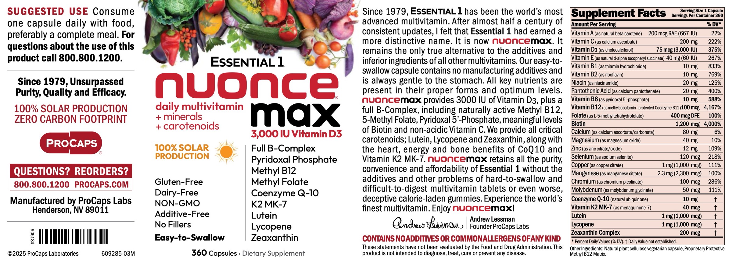 Since 1979, ESSENTIAL 1 has been the world’s most advanced multivitamin. After almost half a century of consistent updates, I felt that Essential 1 had earned a more distinctive name. It is now nuonce max. It remains the only true alternative to the additives and inferior ingredients of all other multivitamins. Our easy-to-swallow capsule contains no manufacturing additives and is always gentle to the stomach. All key nutrients are present in their proper forms and optimum levels. nuonce max provides 3000 IU of Vitamin D3, plus a full B-Complex, including naturally active Methyl B12, 5-Methyl Folate, Pyridoxal 5’-Phosphate, meaningful levels of Biotin and non-acidic Vitamin C. We provide all critical carotenoids; Lutein, Lycopene and Zeaxanthin, along with the heart, energy and bone benefits of CoQ10 and Vitamin K2 MK-7. nuonce max retains all the purity, convenience and affordability of Essential 1 without the additives and other problems of hard-to-swallow and difficult-to-digest multivitamin tablets or even worse, deceptive calorie-laden gummies. Experience the world’s finest multivitamin. Enjoy nuonce max! Andrew Lessman Founder ProCaps Labs These statements have not been evaluated by the Food and Drug Administration. This product is not intended to diagnose, treat, cure or prevent any disease.
