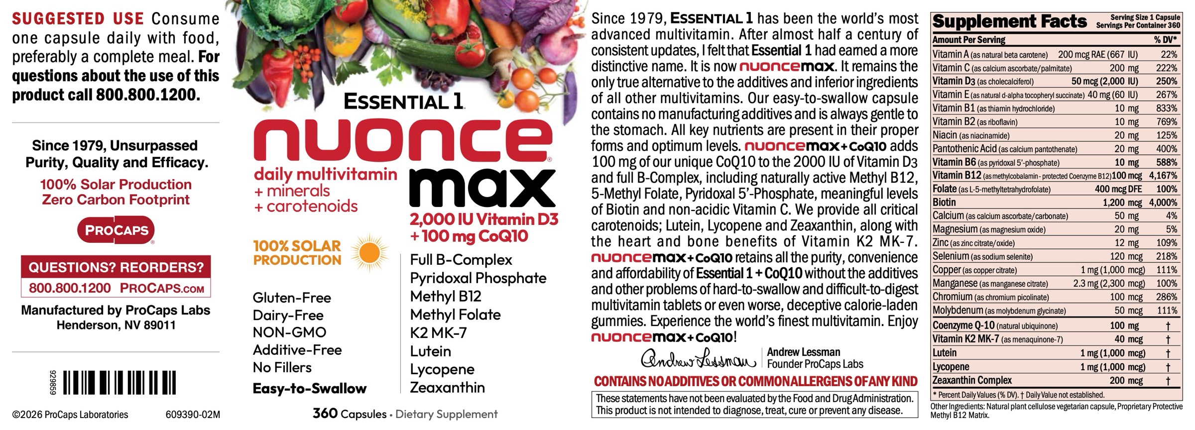 Free shippingSince 1979, ESSENTIAL 1 has been the world’s most advanced multivitamin. After almost half a century of consistent updates, I felt that Essential 1 had earned a more distinctive name. It is now nuoncemax. It remains the only true alternative to the additives and inferior ingredients of all other multivitamins. Our easy-to-swallow capsule contains no manufacturing additives and is always gentle to the stomach. All key nutrients are present in their proper forms and optimum levels. nuoncemax + CoQ10 adds 100 mg of our unique CoQ10 to the 2000 IU of Vitamin D3 and full B-Complex, including naturally active Methyl B12, 5-Methyl Folate, Pyridoxal 5’-Phosphate, meaningful levels of Biotin and non-acidic Vitamin C. We provide all critical carotenoids; Lutein, Lycopene and Zeaxanthin, along with the heart and bone benefits of Vitamin K2 MK-7. nuoncemax + CoQ10 retains all the purity, convenience and affordability of Essential 1 + CoQ10 without the additives and other problems of hard-to-swallow and difficult-to-digest multivitamin tablets or even worse, deceptive calorie-laden gummies. Experience the world’s finest multivitamin. Enjoy nuoncemax + CoQ10! [Andrew Lessman Signature] Andrew Lessman Founder ProCaps Labs These statements have not been evaluated by the Food and Drug Administration. This product is not intended to diagnose, treat, cure or prevent any disease.