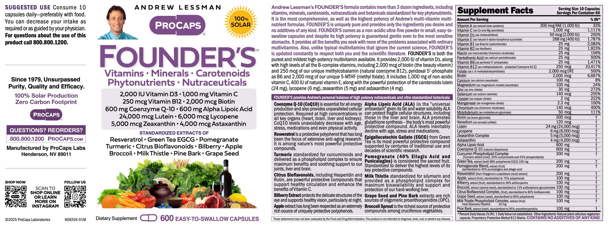 Andrew Lessman’s FOUNDER’S formula contains more than 3 dozen ingredients, including vitamins, minerals, carotenoids, nutraceuticals and botanicals standardized for key phytonutrients. It is the most comprehensive, as well as the highest potency of Andrew’s multi-vitamin multi-nutrient formulas. FOUNDER’S is uniquely pure and provides only the ingredients you desire and no additives of any kind. FOUNDER’S comes as a non-acidic ultra-fine powder in small, easy-to-swallow capsules and despite its high potency is guaranteed gentle even to the most sensitive stomachs. It provides all the benefits you seek with none of the problems associated with ordinary multivitamins. Also, unlike typical multi-vitamins that ignore the current science, FOUNDER’S is updated constantly to respect both you and the scientific literature. FOUNDER’S is both the purest and mildest high-potency multivitamin available. It provides 2,000 IU of vitamin D3, along with high levels of all the B-complex vitamins, including 2,000 mcg of biotin (the beauty vitamin) and 250 mcg of our unique methylcobalamin (natural coenzyme B12), pyridoxal 5’-phosphate as B6 and 2,000 mcg of our unique 5-MTHF (methyl folate). It includes 1,000 mg of non-acidic vitamin C, 400 IU of natural vitamin E, along with the powerful protection of the carotenoids lutein (24 mg), lycopene (6 mg), zeaxanthin (5 mg) and astaxanthin (4 mg). FOUNDER’S provides Andrew’s personal balance of high potency nutraceuticals and ultra-standardized botanicals: Coenzyme Q-10 (CoQ10) is essential for all energy production and also provides unparalleled cellular protection. Required at high concentrations in all key organs (heart, brain, liver and kidneys). CoQ10 levels unavoidably decrease with age, stress, medications and even physical activity. Alpha Lipoic Acid (ALA) is the “universal antioxidant” given its fat and water solubility. ALA can protect fragile cellular structures, including those in the liver and brain. ALA promotes glutathione synthesis – the body’s most powerful protective compound. ALA levels inevitably decline with age, stress and medications. Resveratrol is a protective polyphenol that has long been the focus of extensive anti-aging research. It is among nature’s most powerful protective compounds. Epigallocatechin Gallate (EGCG) from Green Tea is its most powerful protective compound supported by centuries of traditional use and decades of scientific research. Turmeric standardized for curcuminoids and delivered as a phospholipid complex to ensure maximum benefits and soothing support to our joints, liver and brain. Pomegranate (40% Ellagic Acid and Punicalagins) is considered the sacred fruit. Standardized to deliver the highest levels of its key protective compounds. Citrus Bioflavonoids including Hesperidin and Rutin, are powerful protective compounds that support healthy circulation and enhance the benefits of Vitamin C. Milk Thistle standardized for silymarin and provided as a phospholipid complex for maximum bioavailability and support and protection of our hard-working liver. Bilberry Extract protects the delicate structures of the eye and support healthy vision, particularly at night. Grape Seed and Pine Bark extracts are rich sources of oligomeric proanthocyanidins (OPC). Apple extract has long been respected as an extremely rich source of uniquely protective polyphenols. Broccoli Sprout is the richest source of protective compounds among cruciferous vegetables. These statements have not been evaluated by the Food and Drug Administration. This product is not intended to diagnose, treat, cure or prevent any disease.